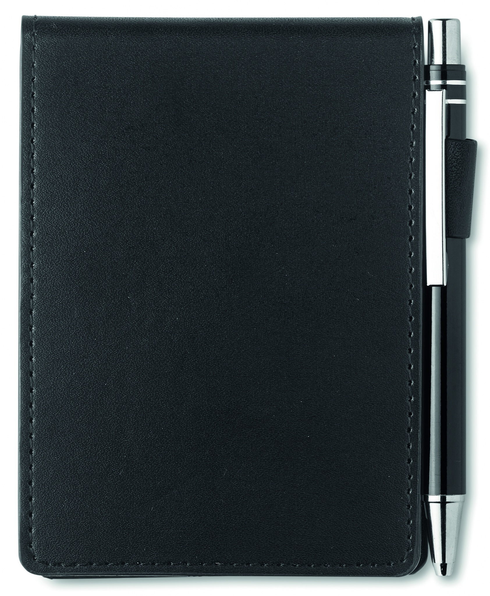 DIN A7 Notizblock im Cover aus PU. 60 Blatt (120 Seiten) perforiertes Blankopapier. Inkl. Druckkugelschreiber aus Metall und Stiftschlaufe. Blaue Tinte.