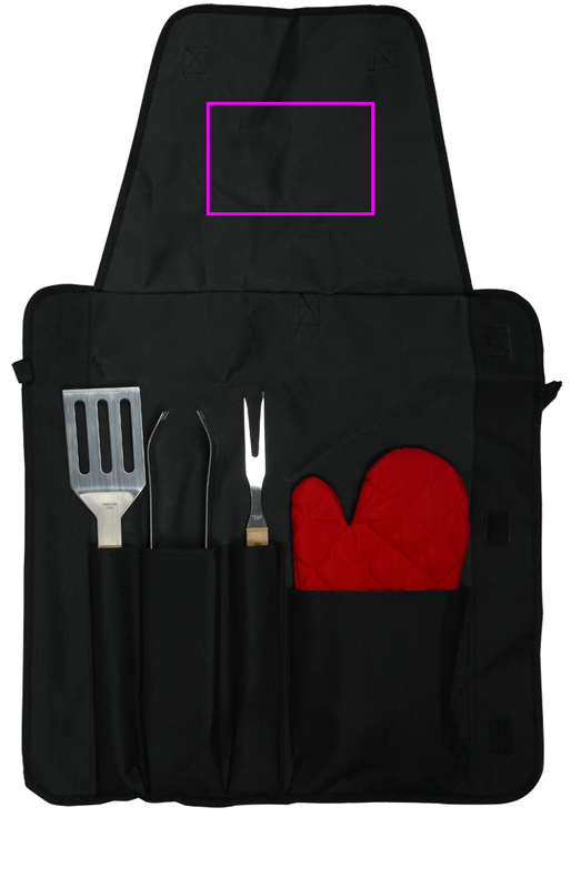 Nylonschürze mit Grillhandschuh, Edelstahlgabel, Zange und Wender mit Holzgriff. Ihr Logo drucken wir auf die Schürze.