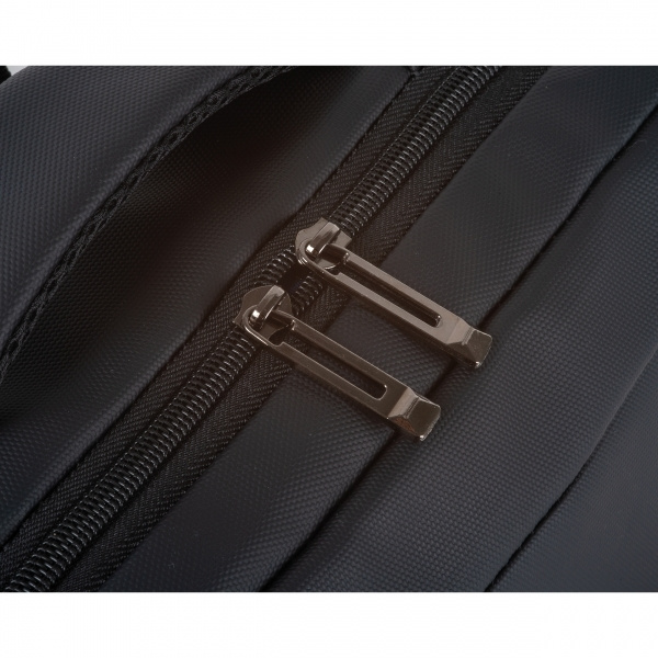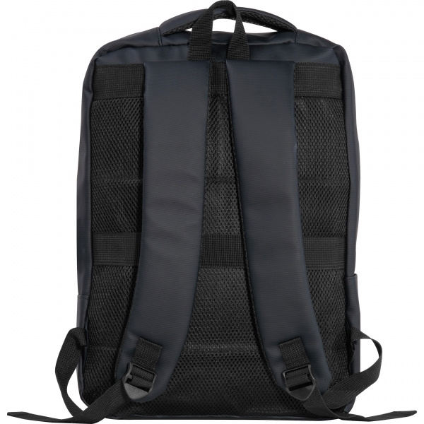Laptop-Rucksack aus PU für 15–16 Zoll Laptops. Er verfügt über zwei Reißverschluss-Frontfächer, ein großes Hauptfach mit Polsterung für den Laptop, diverse Einsteckfächer im Inneren, gepolsterte Schultergurte, einen Tragegriff und eine rückseitige Schlaufe zur Befestigung am Trolley. Ihre Werbung wird auf dem Frontfach aufgebracht.