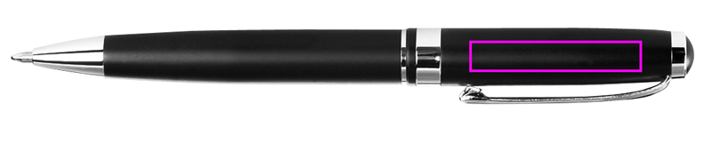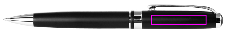 Hochwertiger Metallkugelschreiber in mattem Schwarz mit glänzenden Silberapplikationen und edlem Etui. Ihre Werbung gravieren wir unterhalb des Clips.