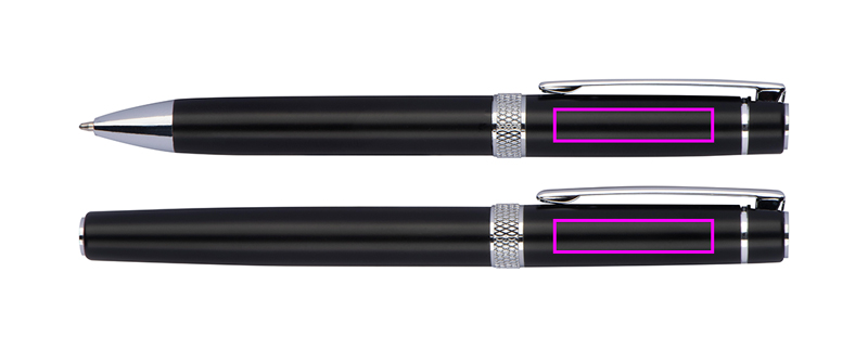 Schreibset bestehend aus einem Drehkugelschreiber mit blauschreibender Systemmine und einem blauschreibenden Rollerball aus Aluminium im Etui. Die Chromapplikationen und die funkelnden Zierringe verleihen dem Set seine edle Optik. Ihre Werbung wird auf beiden Stiften rechts neben dem Clip eingraviert.