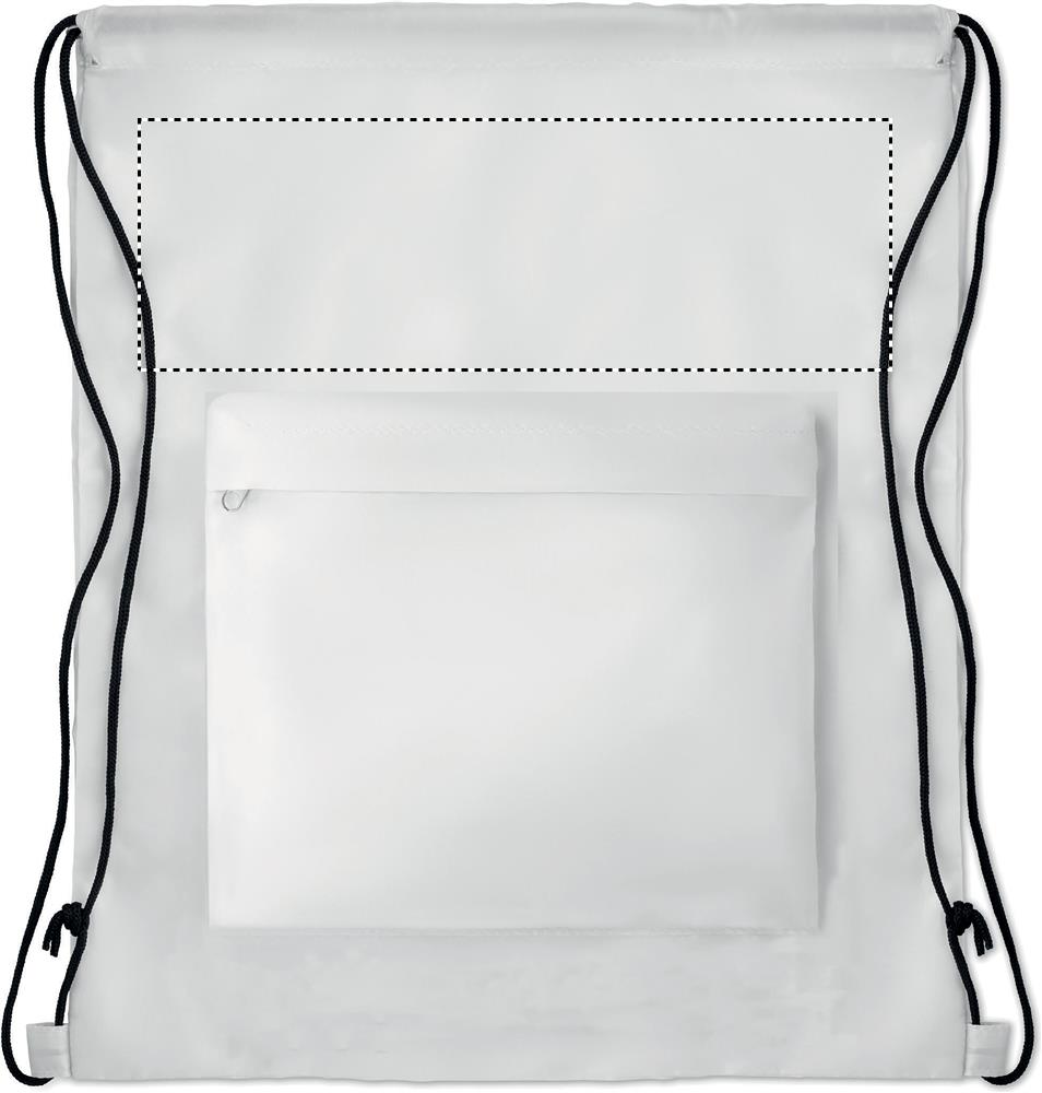 Large drawstring bag in 210D polyester with zippered front pocket.