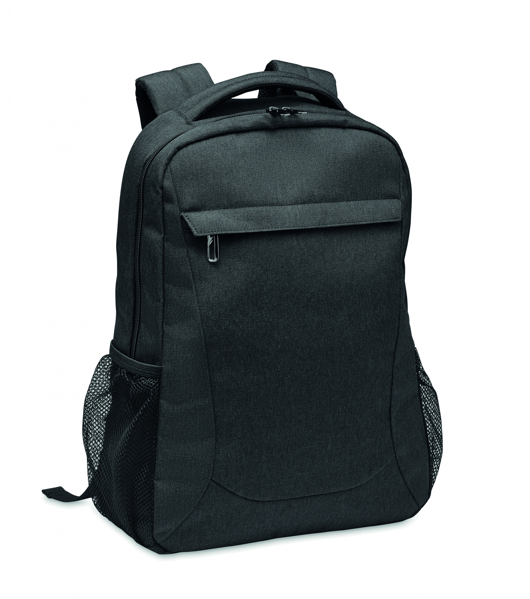 15 inch laptop backpack in 600D RPET polyester. Internal laptop compartment and several small inner compartments. It has a front zippered pocket and 2 side mesh pockets. Adjustable shoulder straps. Trolley holder on reverse side.