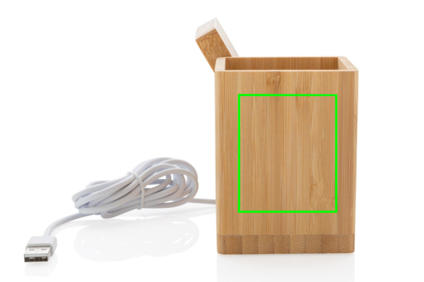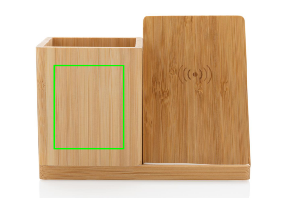10W wireless fast charger with pen holder made with RCS (Recycled Claim Standard) certified recycled ABS. Total recycled content: 6% based on total item weight (including bamboo base) The bamboo exterior of the organiser is fully made from FSC 100 bamboo. Including 120 cm type C charging cable made from RCS certified recycled TPE. Packed in FSC mix kraft box. Type-C Input 5V/2A; 9V/1.67A. Wireless output 5V/1A;9V/1.1A (10W) Registered design®