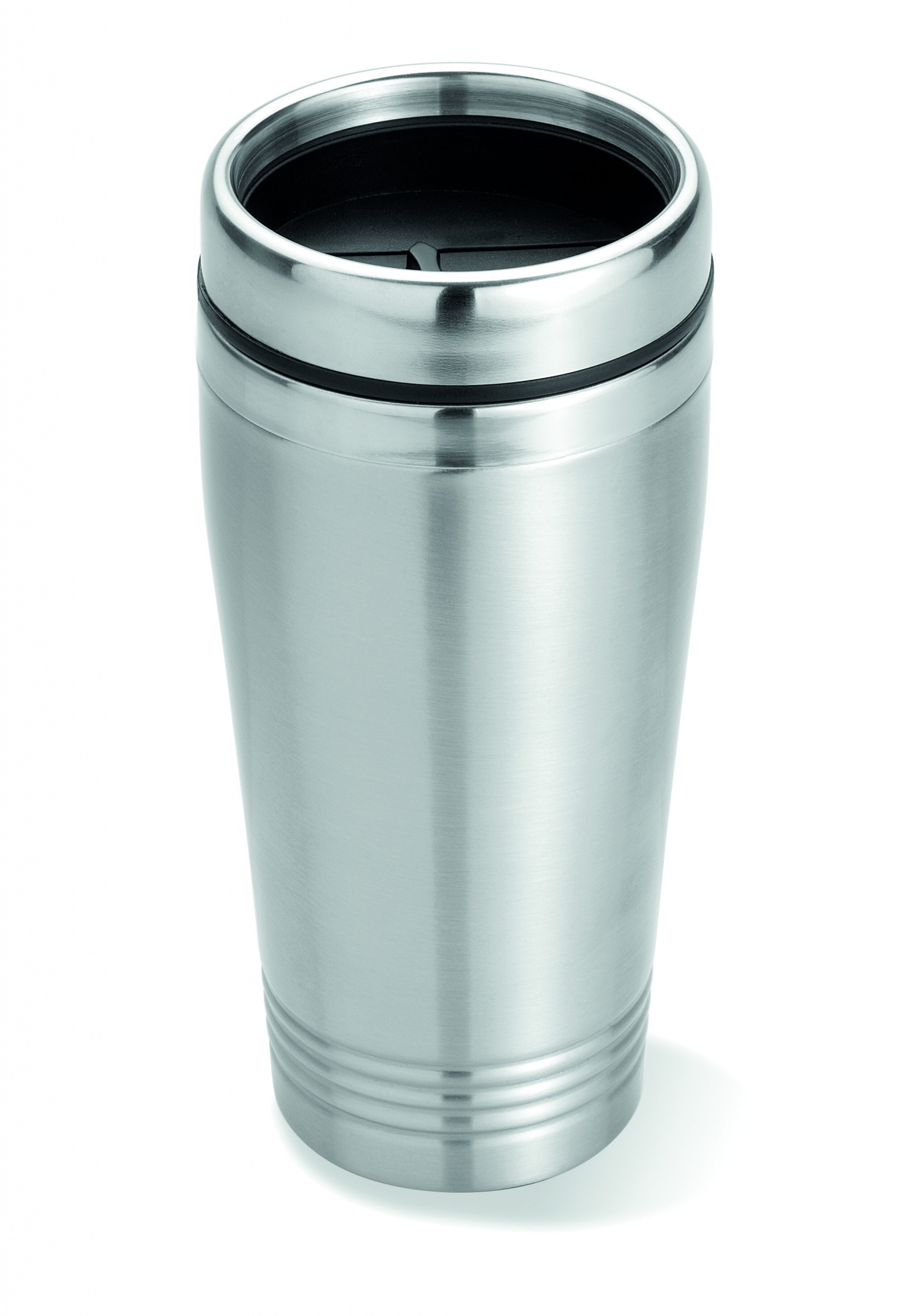 Double wall stainless steel travel cup with black PP lid. Capacity: 400 ml.