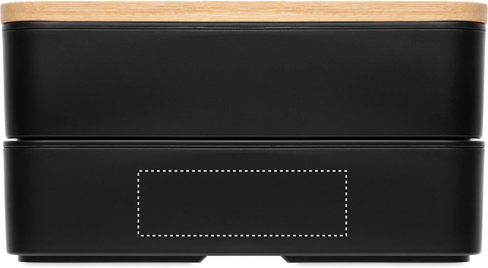 PP two-tier lunch box with bamboo lid including 1 removable PP divider and 3 cutlery utensils with attachable polyester band. Capacity 400ml (2x). Bamboo is a natural product, there may be slight variations in colour and size per item, which can affect the final decoration outcome.