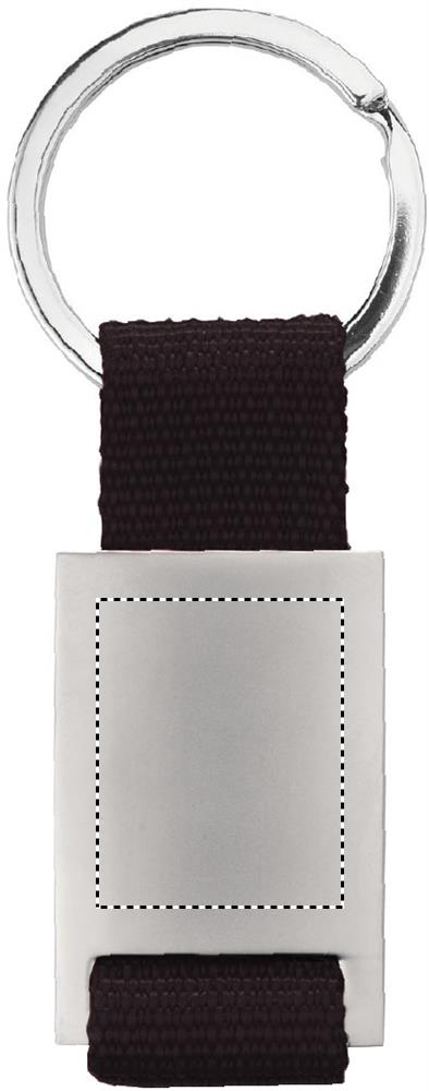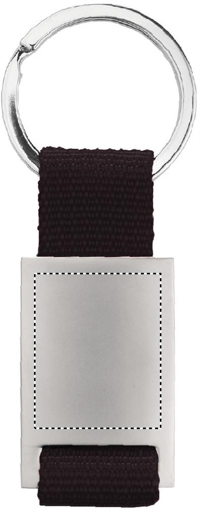 Metal rectangular key ring with coloured polyester webbing. Individually packed in a carton gift box.