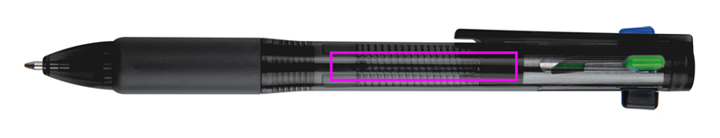 Plastic ballpen with 4 colored writing mines (blue, black, red, and green.) Your logo will be printed below the clip.