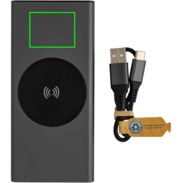 Ultra-fast charging powerbank made with RCS (Recycled Claim Standard) certified recycled aluminium and ABS. Total recycled content: 28% based on total item weight. RCS certification ensures a completely certified supply chain of the recycled materials. Aluminium does not lose its characteristics in the recycling process and can be recycled endlessly. The powerbank contains a long-lasting grade A 10.000 mAh lithium polymer battery. The C output port supports fast charging up to 18W and also fast re-charging within 3 hours. The wireless charger supports wireless charging up to 10W. The power indicators will indicate the remaining energy level so you always know when to re-charge. Item and accessories 100% PVC free. Including type C charging cable made from RCS certified recycled aluminium, TPE and PET. Packed in FSC® mix packaging. USB output 5/3A, 9V/2A. 12V/1.5A. Type C output: 5V/3A, 9V/2A, 12V/1.5A. Type C input: 5V/3A, 9V/2A, 12V/1.5A. Micro USB input: 5V/2A, 9V/2A, 12V/1.5A.
