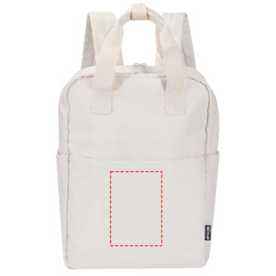 The Trip Aware™ recycled travel laptop backpack is a compact, lightweight backpack designed for streamlined travel and everyday use. Made from durable 290D twill polyester with a soft knitted backing and lined with RPET 210D/PU, it combines functionality with a clean, practical design. It features two side pockets for water bottles, dual carry handles, and comfortable shoulder straps. The front zip pocket includes organised storage for a passport, pens, and a ribbon for keys, while the main compartment fits a notebook or tablet. A separate 14” laptop compartment and a trolley sleeve on the back make it especially suitable for travel. Each bag also comes with an Aware™ tracer. This innovative feature allows users to trace the origins and journey of their item through a QR code, enhancing transparency in the supply chain and fostering a stronger connection between the product and its production process. Volume capacity: 9 litres.
