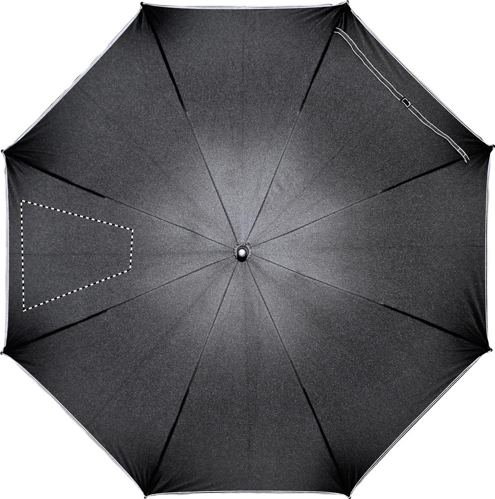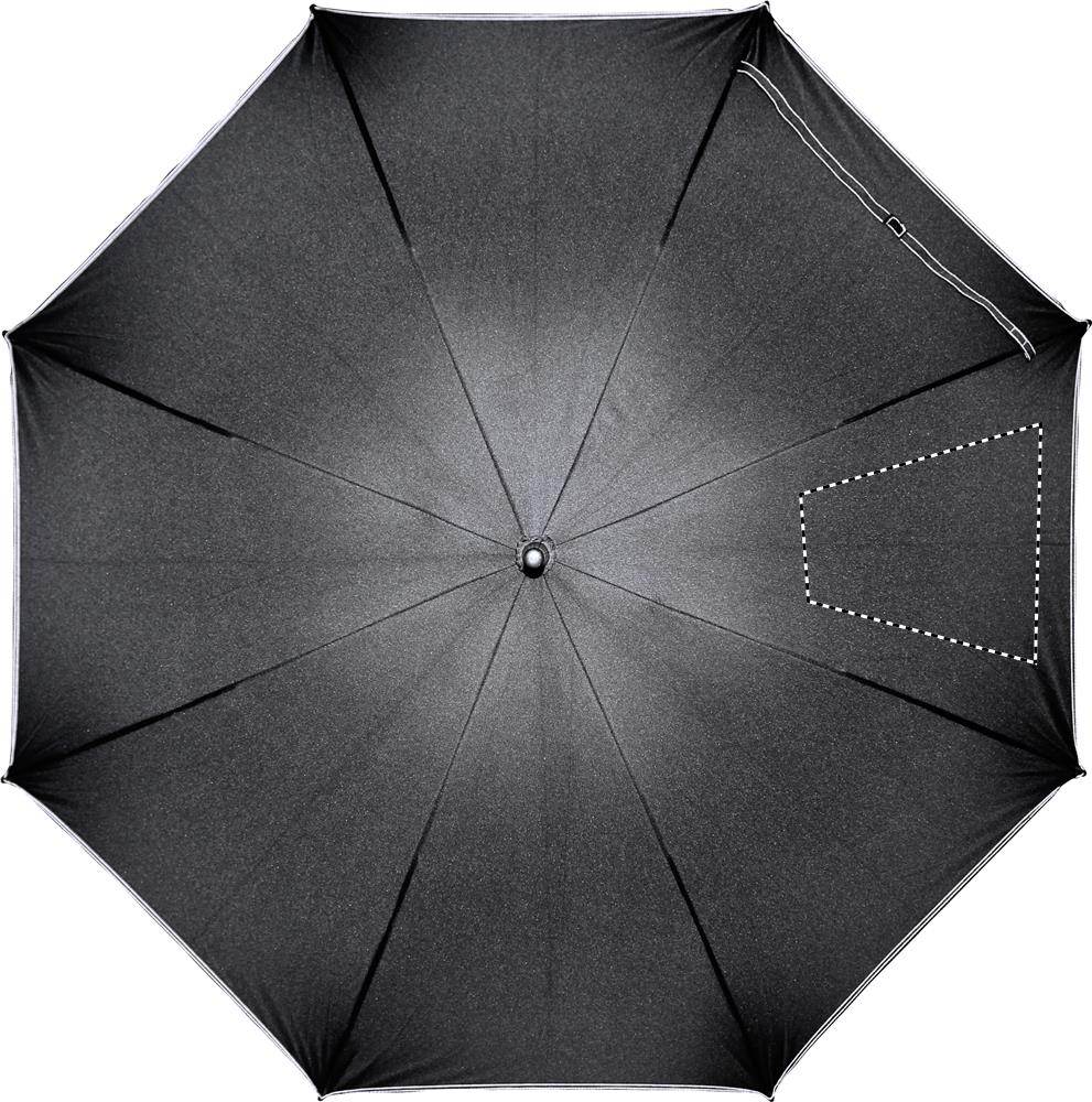 23-tolline automaatselt avatav tuulekindel vihmavari 190T pongee klaaskiust varre ja mustade plastikotstega ribidega. Musta värvi paneelid sobivat värvi õmblustega. Sirge must plastikust käepide. Käsitsi sulgemine.