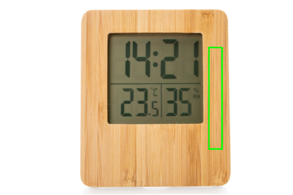 3 funktsiooniga bambusest ilmajaam: kellaaeg/kuupäev, siseruumide niiskus ja temperatuur. Kaasas 2 AAA patareid otseseks kasutamiseks. Materjal bambus ja ABS. Niiskuse taluvus max 5%.