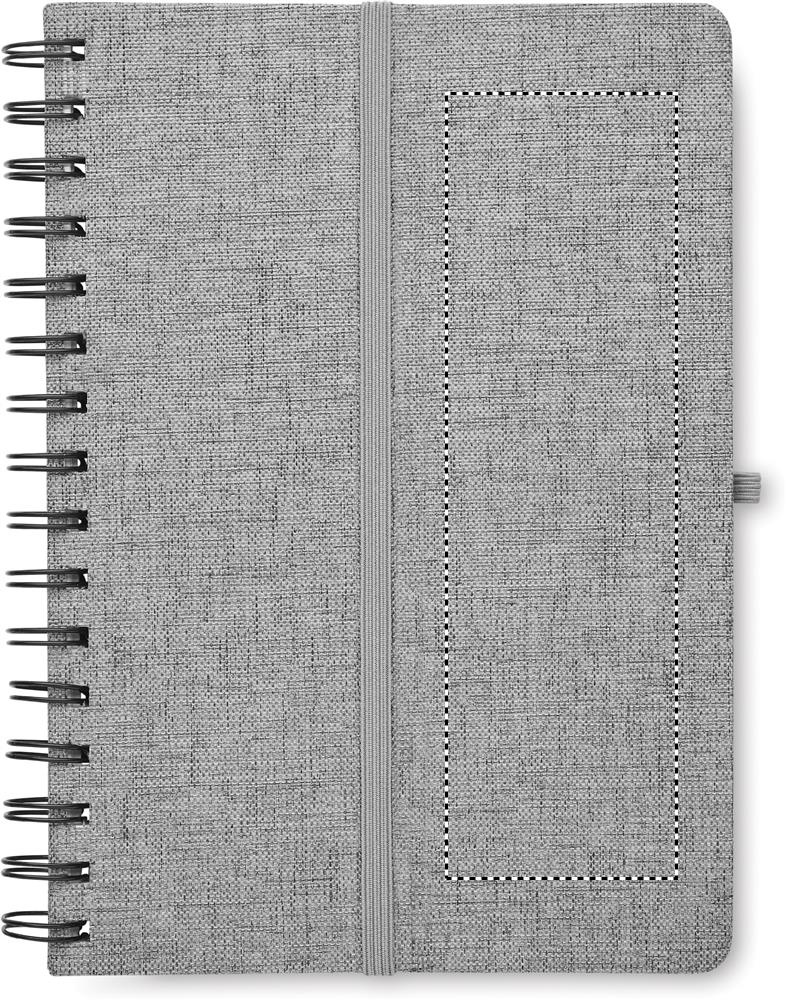 A5 märkmik 600D RPET nutitelefoni aluse funktsiooniga. 160 joonelist lehte (80 lehte). 70 gsm taaskasutatud paber. Elastne sulgemisrihm.