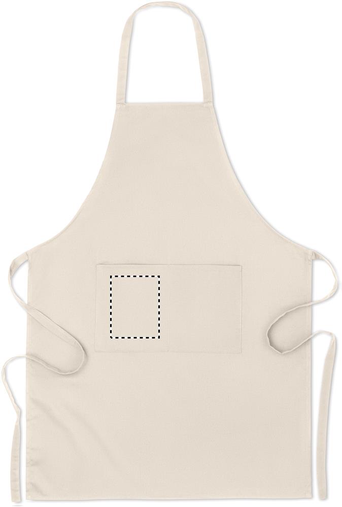 200 gr/m² orgaanisesta puuvillasta valmistettu esiliina, 2 etutaskulla.