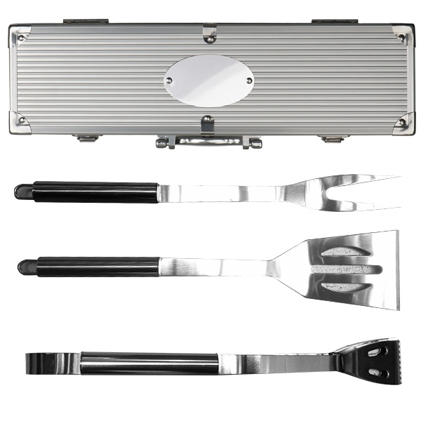 Grillikotelo, jossa on grillipihdit, lihahaarukka ja grillin kääntäjä metallikotelossa. Laserimme logosi kotelon soikeaan metallilevyyn.