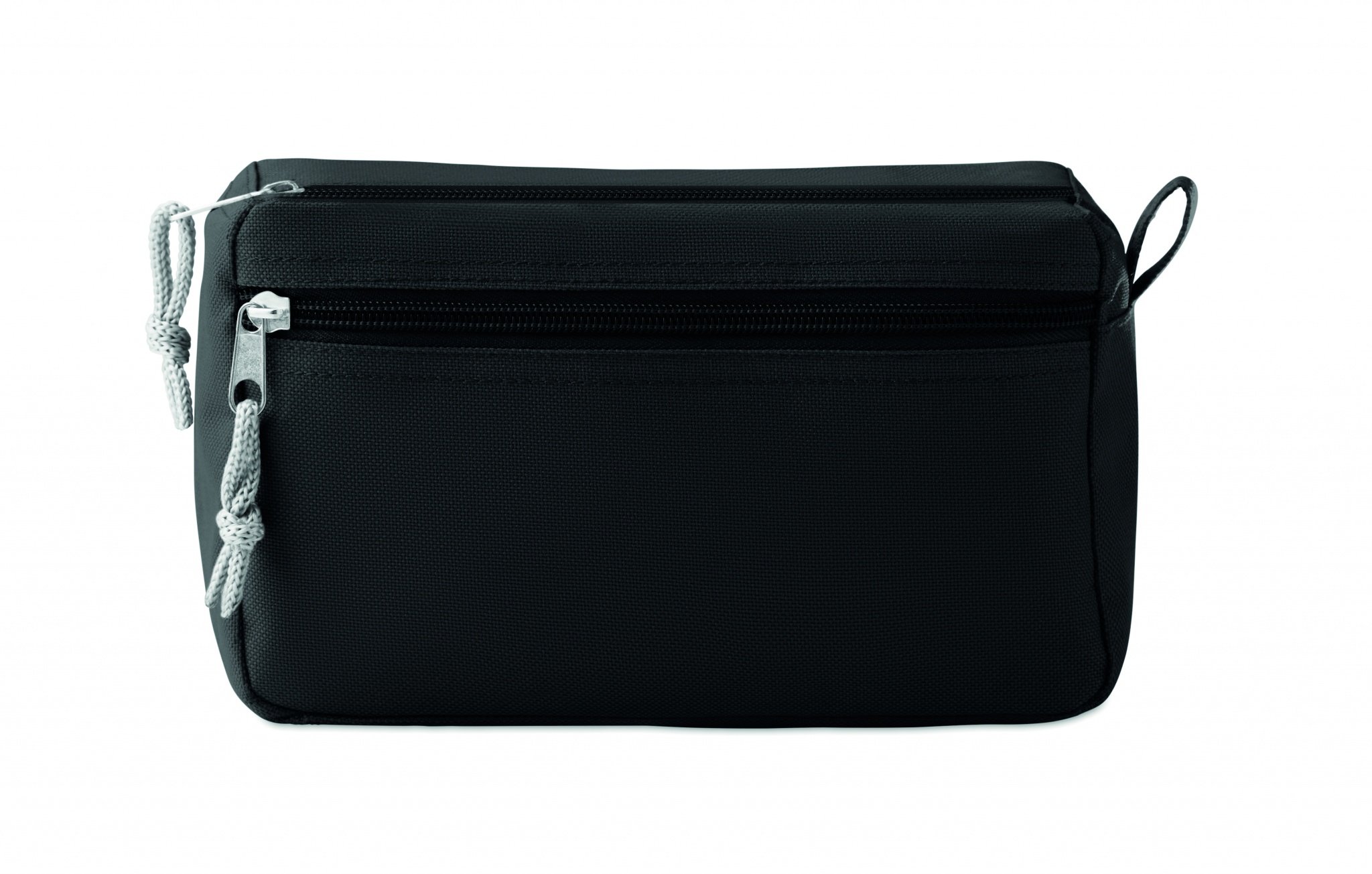 600D- polyesterinen kosmetiikkalaukku PPE-taustalla, kahdella vetoketjullisella taskulla.