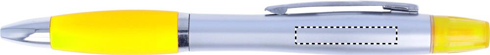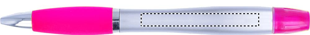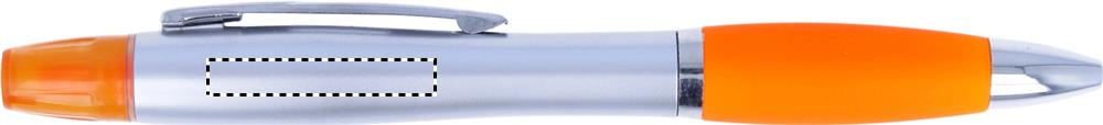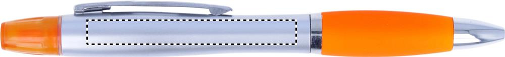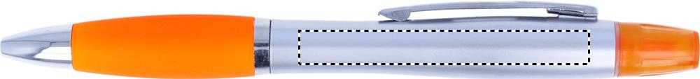 2 in 1 muovinen korostuskynä ja kuulakärkikynä sinisellä musteella. Hopenvärinen satiini viimeistely, kromi päällystetyt yksityiskohdat.
