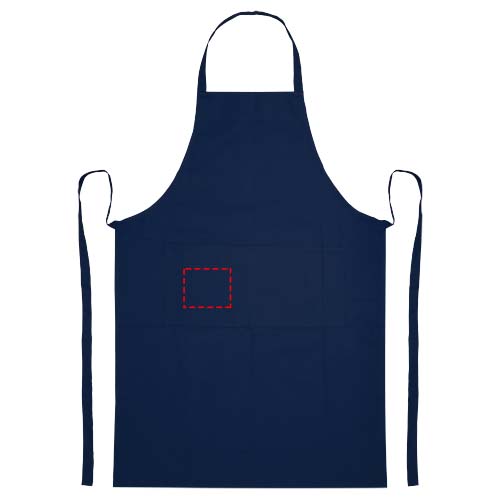 Ympäristöystävällisestä, 200 g/m² luomupuuvillasta valmistettu esiliina. Sisältää kaksi vierekkäistä taskua, joiden yhteiskoko on 45 x 20 cm ja metrin pituiset sidontanauhat. Kaulahihnan pituus: 55 cm.