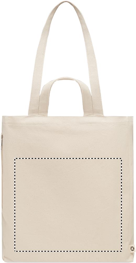 Kierrätysmateriaalista valmistettu ostos- tai rantakassi lyhyillä kantokahvoilla. Kassissa on vetoketjullinen sivutasku. Materiaali 70 % kierrätettyä puuvillaa/ 30 % kierrätettyä polyesteriä, 380 gr/m².