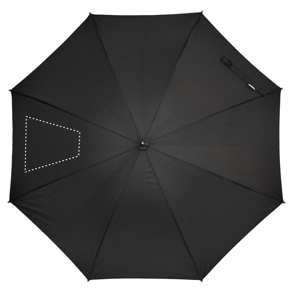 23 colių automatiškai atidaromas skėtis iš 190T RPET su mediniu kotu, antgaliais ir viršumi. Juodai dengti metaliniai šonkauliai. Lenkta natūralios apdailos medinė rankena. Rankinis uždarymas.