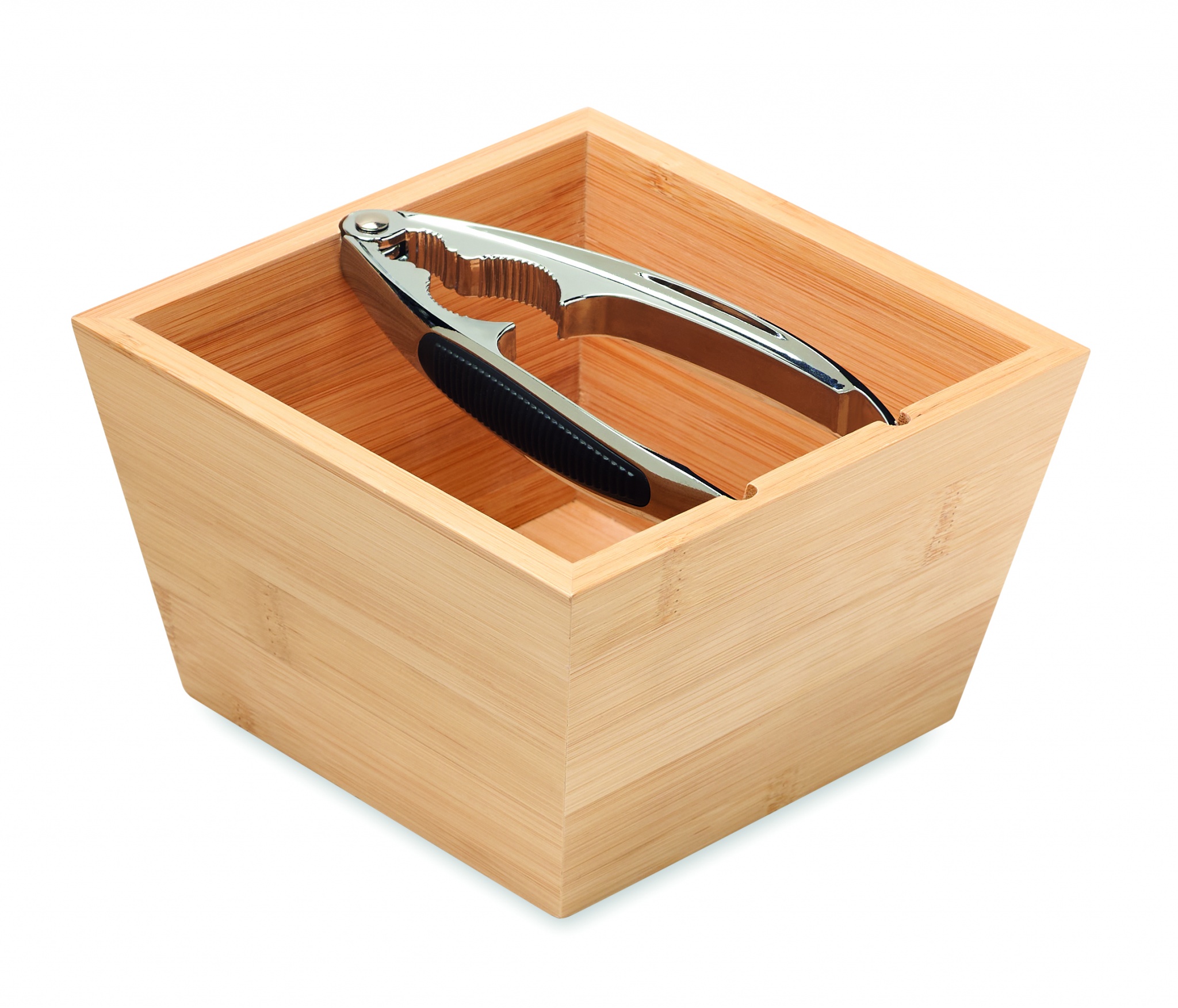 Riešutų traškučių rinkinys su bambukiniu dubeniu ir sidabro spalvos riešutų traškučiu iš cinko lydinio su TPR rankena. Bambukas yra natūralus produktas, gali šiek tiek skirtis kiekvieno gaminio spalva ir dydis, o tai gali turėti įtakos galutiniam dekoravimo rezultatui.
