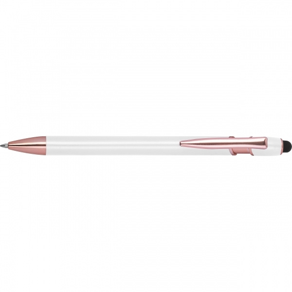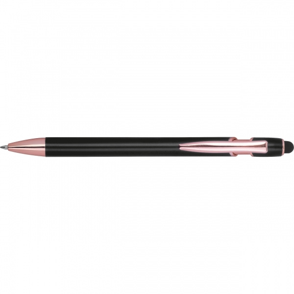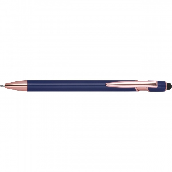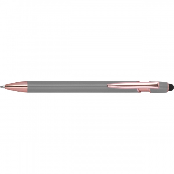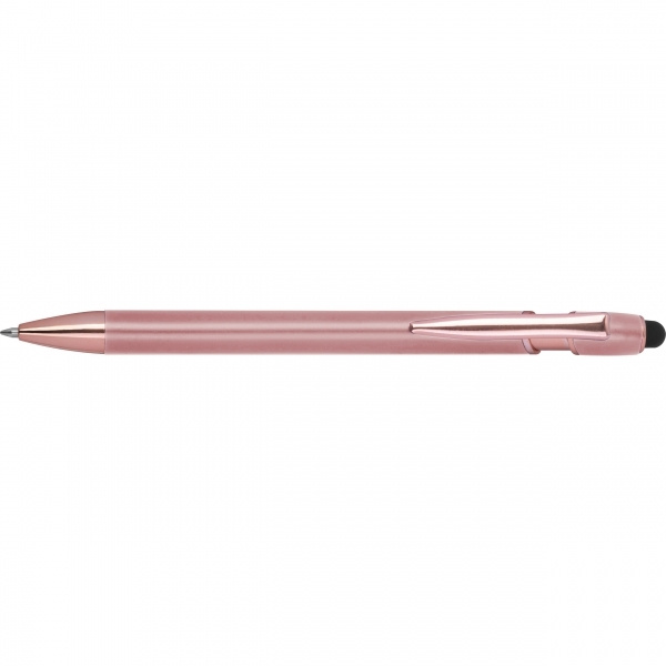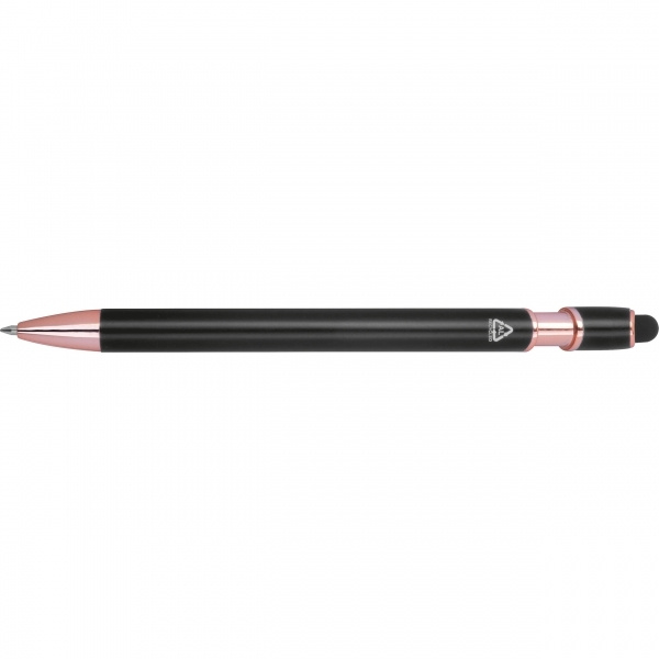 Pusgēla pildspalva, izgatavota no pārstrādāta alumīnija, ar skārienirbuli un lielas ietilpības uzpildīti zili rakstot (1 mm uzgalis). Jūsu logotips ir uzklāts uz korpusa, izmantojot lāzergravējumu.