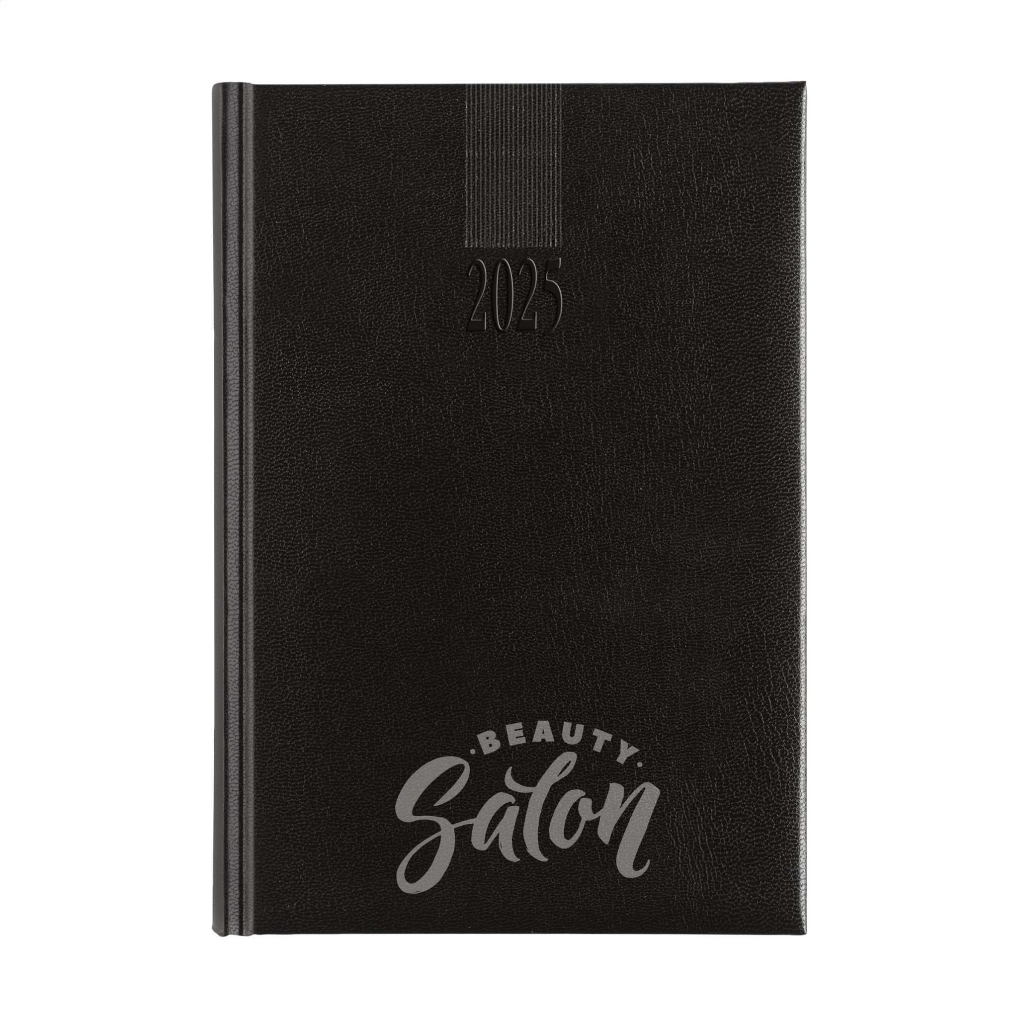 Офисный ежедневник на шести языках: EN, NL, F, D, I и ES. С прочной мягкой обложкой Balacron и декоративно тисненным годом спереди, 70 г белой, сертифицированной FSC Mix бумагой, печать в 2 цветах, нитевое скрепление, отрывные уголки с датой, один день на странице (суббота и воскресенье вместе), ежедневник на текущий год и 2 квартала следующего года, место для заметок на каждый день, дополнительные страницы с полезной информацией. Размер близко к A5.
