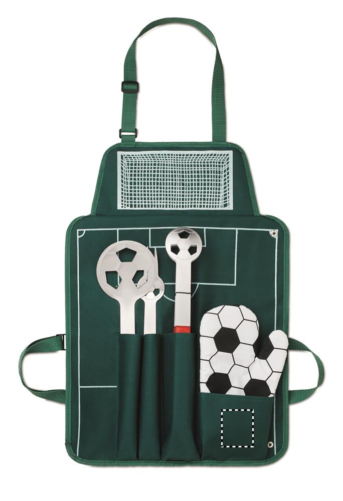 Фартук в футбольной тематике с инструментами для приготовления барбекю. В комплекте щипцы, лопатка, вилка, варежка-прихватка.