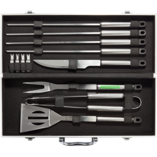 Набор для барбекю из 12 предметов из нержавеющей стали, включая 4 шампура, разделочный нож, 4 держателя для кукурузы, лопатку, разделочную вилку с защитным чехлом и пару щипцов. Упакован в алюминиевый кейс с петлями и ручкой.
