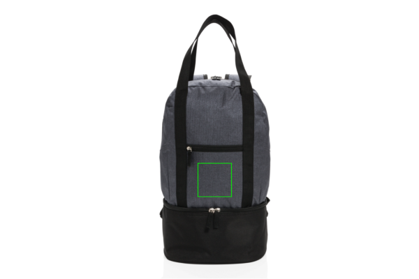 Denna 500D polyester ryggsäck i två färgtoner har ett huvudfack för dina badkläder och ett kylfack i botten med plats för upp till 8 burkar. Lätt att ändra till toteväska med bärremmarna.
