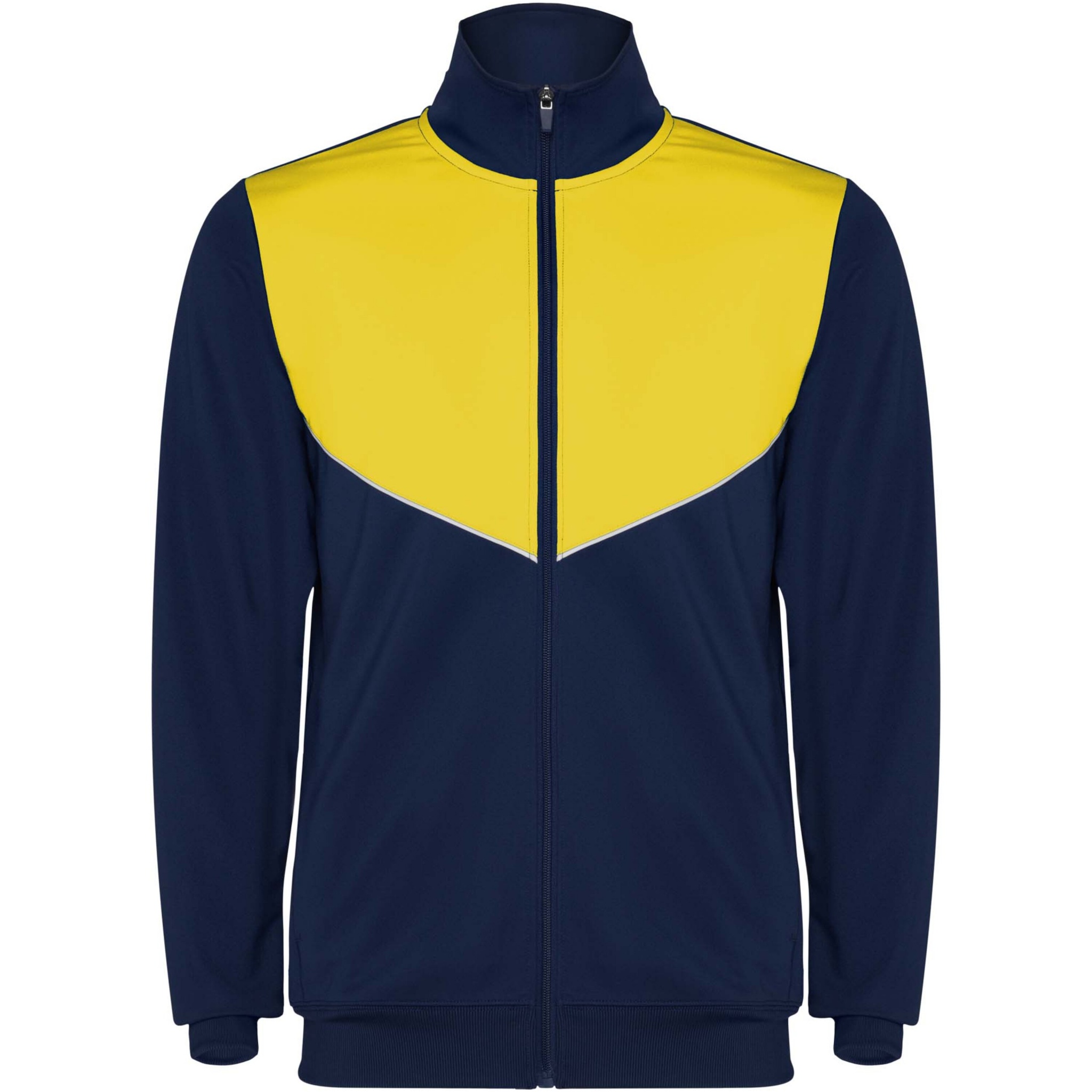 Träningsoverall i lätt och elastiskt tyg. Jacka med kontrasterande färg och sömnadsband på bröstet. Hög krage med kontrasterande sömmar. Dragkedja mitt fram. Sidofickor. 2 x 2 ribbade muddar och midja. Byxor med elastisk linning och dragsko. Kontrasterande sidostycke med sömnadskant. Dragkedja i fåll.