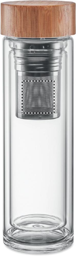 Tillbringare med dubbelvägg i värmetåligt glas och bambulock. Inbyggd the sil. Rymmer 400ml. Läckagefritt.