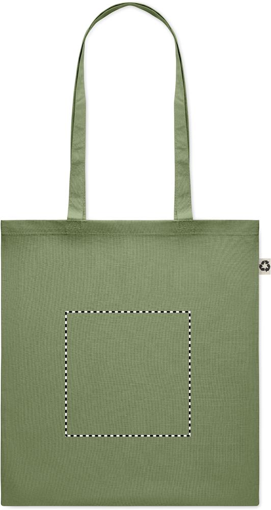 Kasse i återvunnen bomull (65 % återvunnen bomull, 35 % vanlig bomull) med långa handtag. 140 gr/m².