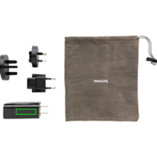 Philips ultrasnabb 30W PD reseladdare. Med praktisk förvaringspouch. Med 4 kontakter, integrerad USA-kontakt och föränderlig AU, UK och EU-kontakter. Input: 100-240V, 50-60Hz 0.7A Output USB A 5V/2.4A Type-C 5V/3A, 9V/2A, 12V/1.5A. Levereras i Philips giftbox.