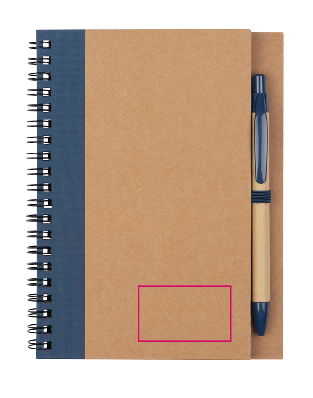 Spiralbunden anteckningsbok med 120 tomma sidor gjorda av återvunnet papper (omslag 250 gsm, sidor 60 gsm) och en pennögla. Den matchande kulspetspennan gjord av återvunnet papper, med en icke-utbytbar blåskrivande refill och ABS-plastdetaljer ingår.