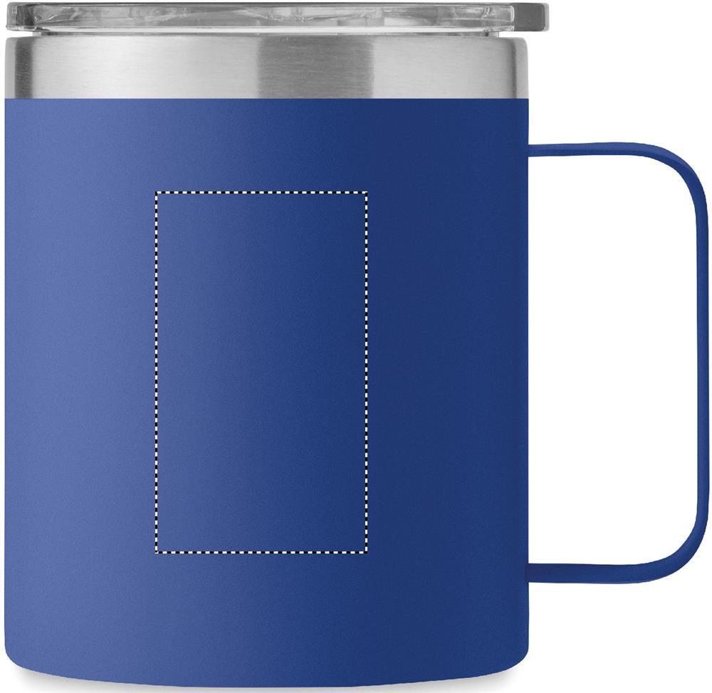 Mugg med dubbelvägg i återvunnet rostfritt stål (90 % återvunnet rostfritt och stål 10 % rostfritt stål) med glidande lock för siphål. Volym: 300 ml.